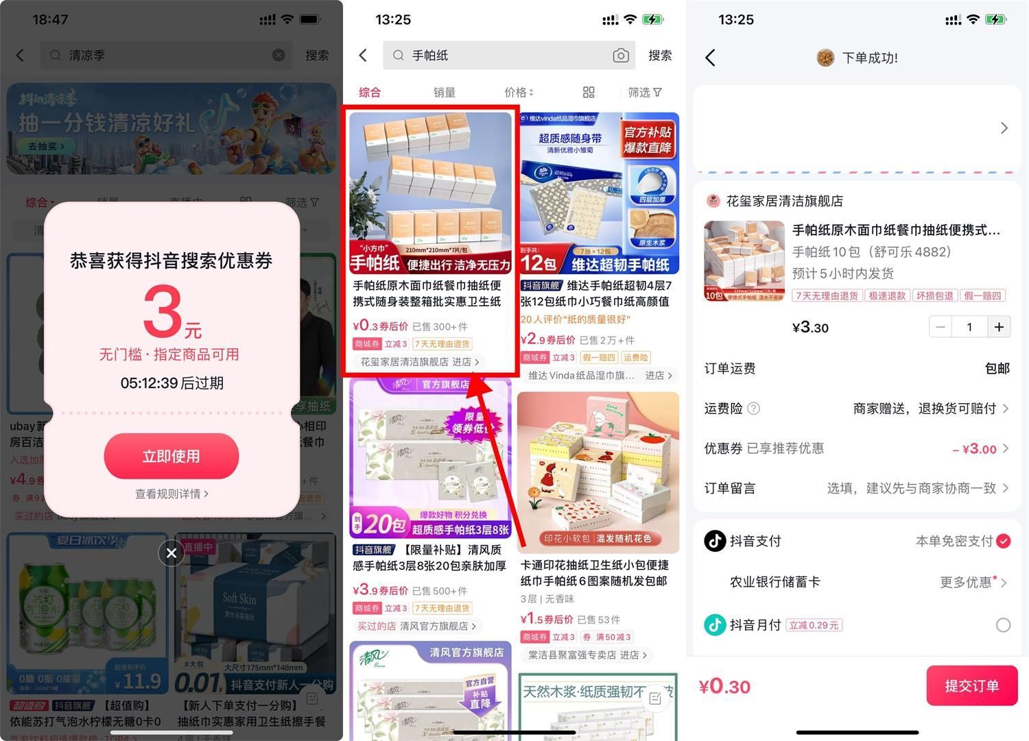 抖音APP搜索“清凉季”->点击横幅进入抽3元券->点“去使用”搜索“手帕纸”找到0.3元的进入包邮到手