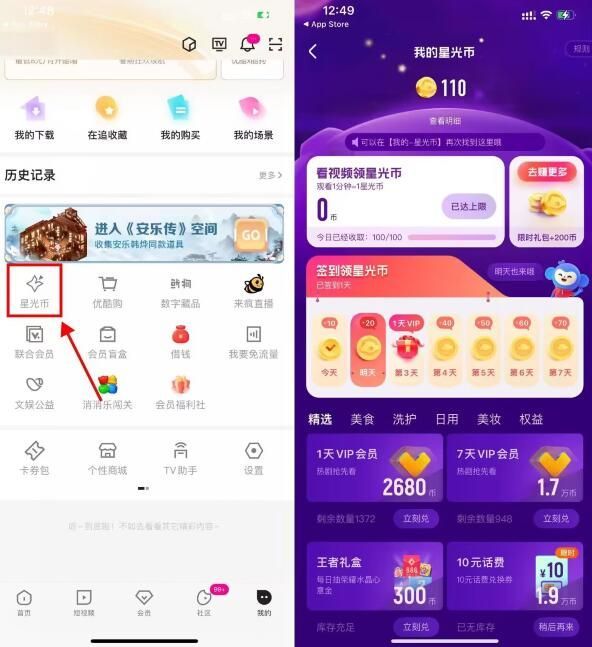 【优酷应用签到三天换取星光币,换取一天会员特权】在最新版本的优酷APP中,用户可通过进入”我的”->”星光币”进行签到,连续签到三天即可兑换优酷会员天卡。