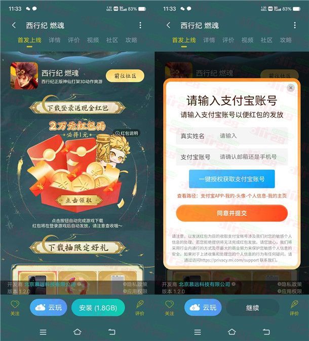 3、在活动里先领红包,再填写支付宝领取,再下载西行记app手游,用参加活动的小米账号登陆一下游戏就会到账支付宝(到了选区服的那个页面就可以退出来了,无需进去区服,只要登录了你的小米账号就会到账)