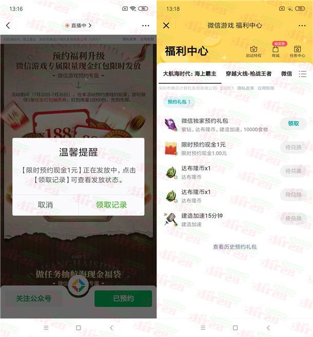 参加大航海时代:海上霸主举办的微信手游预约领红包活动,通过打开微信进去活动里,进去预约游戏可以领到1-188元微信红包,下拉页面完成指定的任务还可以抽奖,得到的红包以卡券的形式到账,手游上线后在微信里下载注册游戏就可以在微信福利中心领取,数量限量。