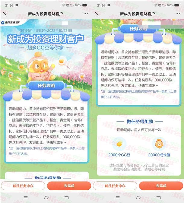 2、报名后根据任务攻略去建设银行APP首次购买指定的任意理财,就可以得到2000个CC豆(购买一个基金理财就行)