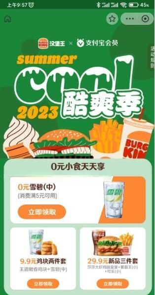 支付宝汉堡王活动:每周免费领0元中雪碧,满5元可用。