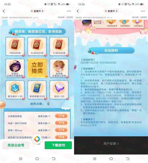 参加王者荣耀举办的微信限时福利新老用户抽红包活动,通过打开微信进去活动里,进去下拉页面可以直接抽奖1次,完成页面指定的任务还可以抽多次,有机会中到2.88-188元微信红包,这个活动建议老用户去,非必中。