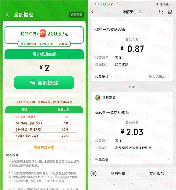 发发果园APP小游戏领微信红包 亲测2.03元秒推零钱