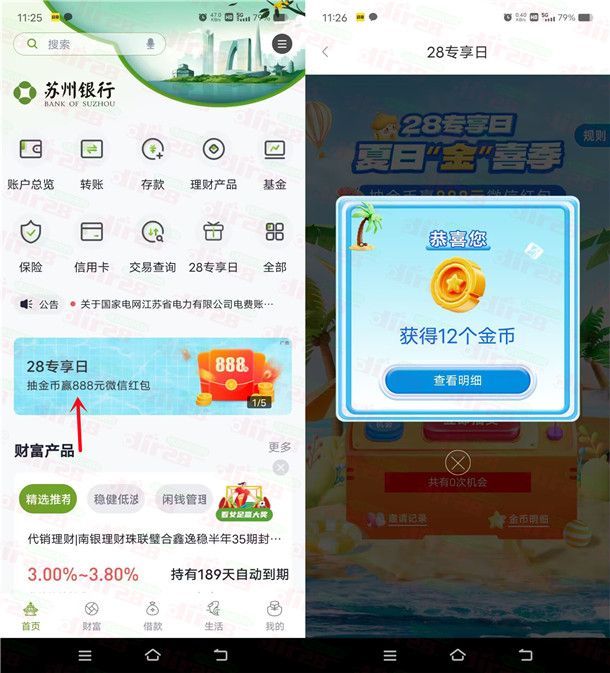 2、打开苏州银行APP,首页点中间滚动图【28专享日】进去,进去默认有1次抽奖机会,有机会中到随机数量的金币