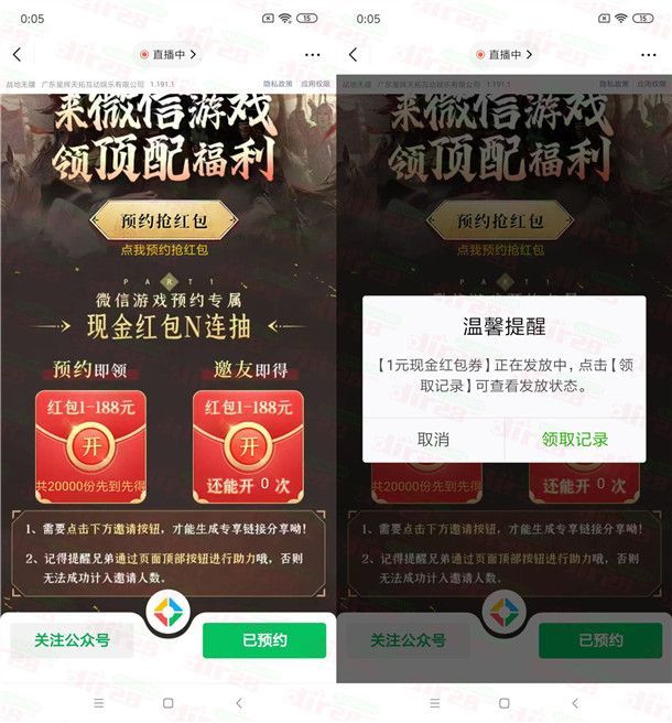 小编提示:进去预约游戏就可以领到1-188元红包,以卡券的形式到账,手游上面后可以在微信福利中心领取,如果之前预约过可以先取消预约再重新预约领,数量限量
