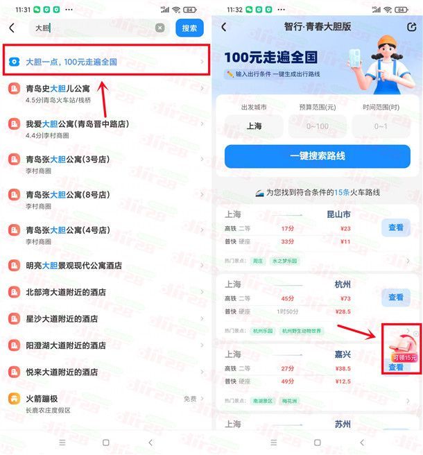 2、打开智行APP,搜索框输入【大胆】再点【大胆一点,100元走遍全国】进去,点击右侧图标【可领15元】进去活动里