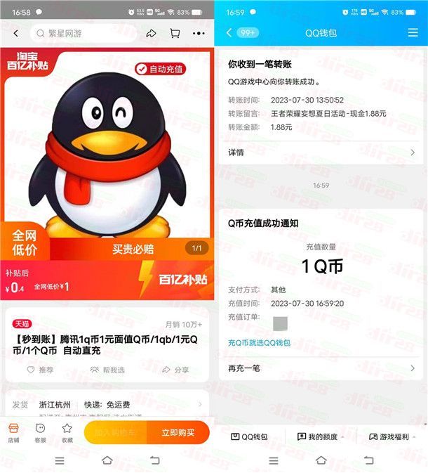 淘宝百亿补贴活动0.4元充值1个Q币!亲测秒到账