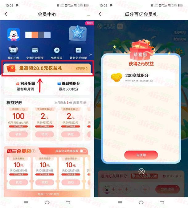 和包瓜分百亿会员礼抽200-880个积分 亲测中500积分 价值5元