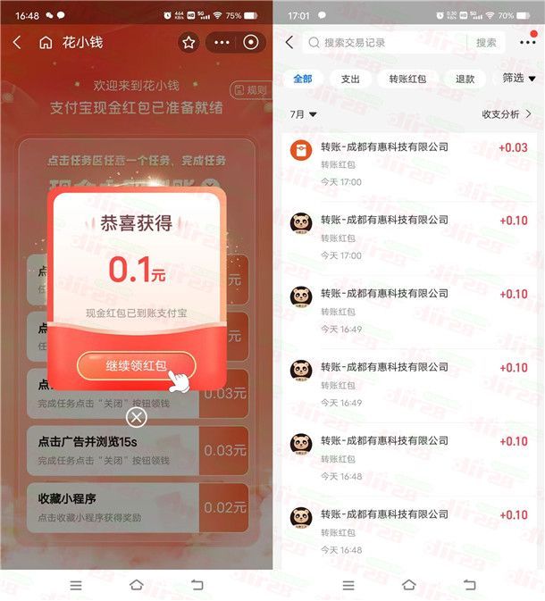 支付宝的一个简单浏览领现金红包的活动,通过打开支付宝APP扫码进去,随便浏览6个商品可以领到0.1元现金红包(可以反复点击同一个商品),可以领到多个红包,小编测试刚领到5个0.1元秒到支付宝余额里,除了0.1元的任务也还有几分钱的任务,红包数量限量。