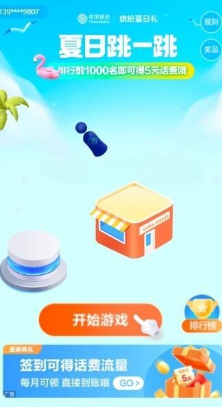 移动夏日跳一跳活动,通过简单的小游戏,即可获得话费券和流量日包等奖品。
