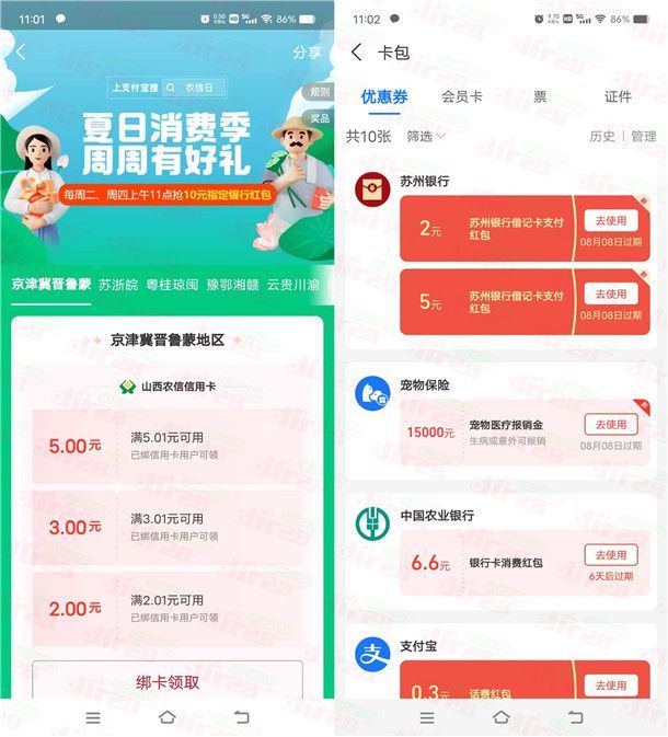 参加支付宝举办的农信日夏日消费季周周有好礼活动,通过打开支付宝APP搜索【农信日】进去活动里,在每周二、周四上午11点开始,进去可以领到10元银行卡红包(分为5元+3元+2元到账),有部分农商银行卡和地方银行卡的可以去参加领取,数量限量。