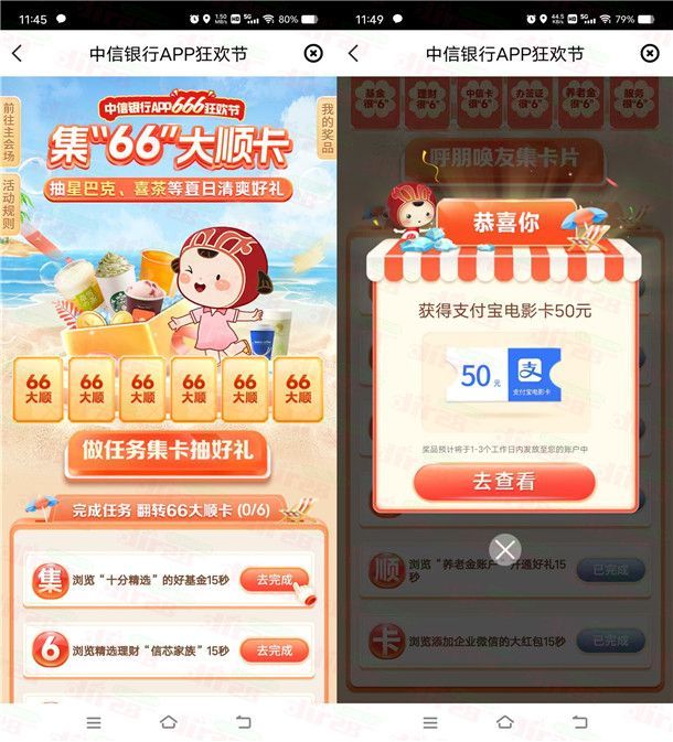 参加中信银行举办的APP狂欢节集66大顺卡抽立减金活动,通过打开中信银行APP进去活动里,下拉页面完成6个简单的浏览15秒的任务,每完成一个任务都可以抽到一张卡片,集齐6张不同的卡片就可以抽奖1次,有机会中到1-666元微信立减金,小编测试中到1元秒到,还中了50元支付宝电影卡。