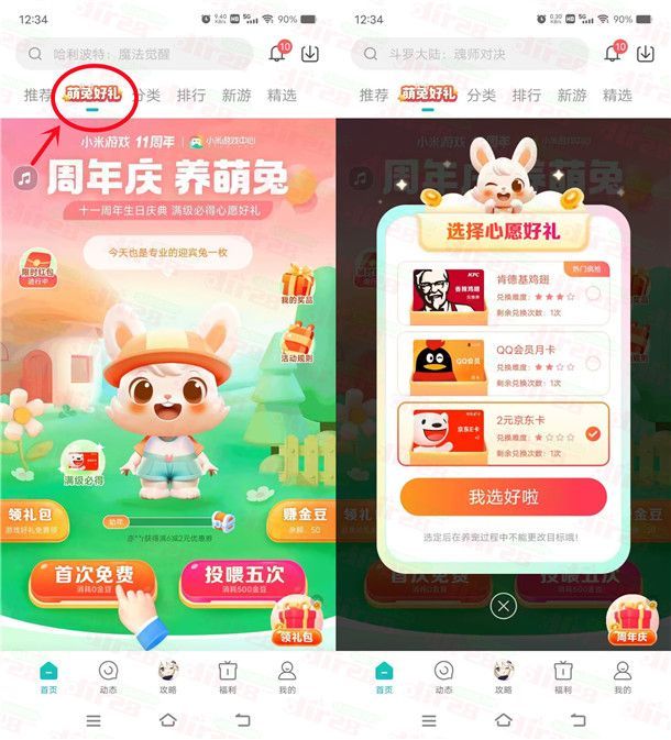 2、打开小米游戏中心APP,点顶部栏目【萌兔好礼】进去,先选择一个心愿好礼(如果想简单一点就选择2元京东卡)