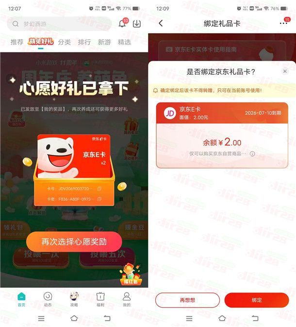 小米游戏中心萌兔好礼领2元京东卡、QQ超级会员月卡 亲测秒到