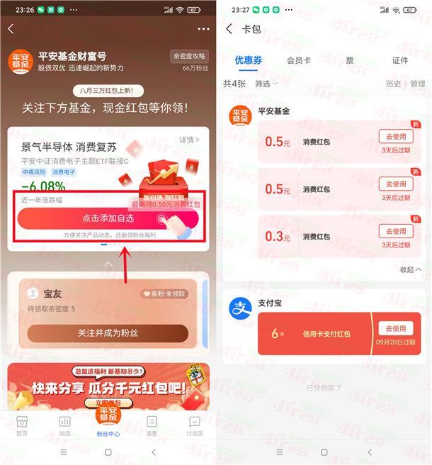 2个支付宝简单的领通用消费红包的活动,通过打开支付宝APP扫码进去活动里,第一个活动是平安基金财富号的,完成3个简单的一键添加自选的活动可以分别领到0.5元+0.5元+0.3元通用消费红包,第二个活动首次关注财富号可以领到一个0.1-2元支付宝消费红包,每天完成一个浏览任务还可以拆盲盒抽1次红包,得到的红包秒到支付宝卡包里,可以在支付宝APP付款的时候无门槛叠加抵扣使用。