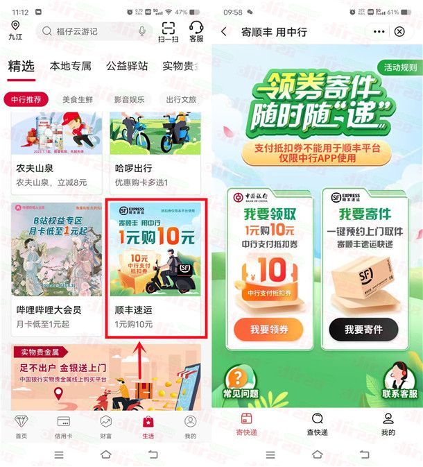 近期需要寄快递的可以去购买参加,还是挺划算的,通过打开中国银行APP进去生活页面,找到1元购10元顺丰速运寄件券进去,按照提示支付1元就可以购买到10元顺丰速运寄件券,购买之后需要填写手机号码领取,然后就可以寄顺丰快递抵扣使用,需要在中国银行APP里寄快递下单才可以抵扣。