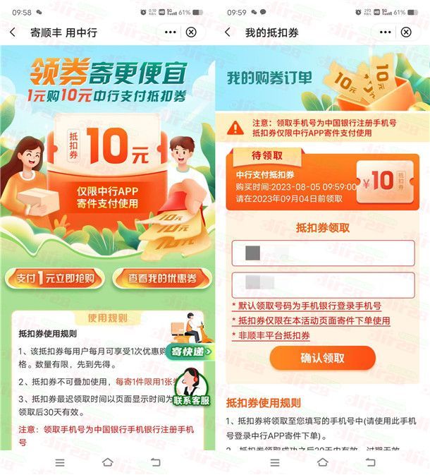 2、支付1元购买10元顺丰速运寄件券,购买之后需要填写手机号码领取,然后就可以寄顺丰快递抵扣使用,需要在中国银行APP里寄快递下单才可以抵扣
