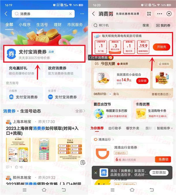 小编提示:打开支付宝APP搜索【消费券】进去,点“开始充”进去完成几个简单的任务(浏览+搜索+随便领一张券),领到红包后秒到支付宝卡包里,可以在线下到店支付的时候选择刷脸支付满5元就可以立减3元