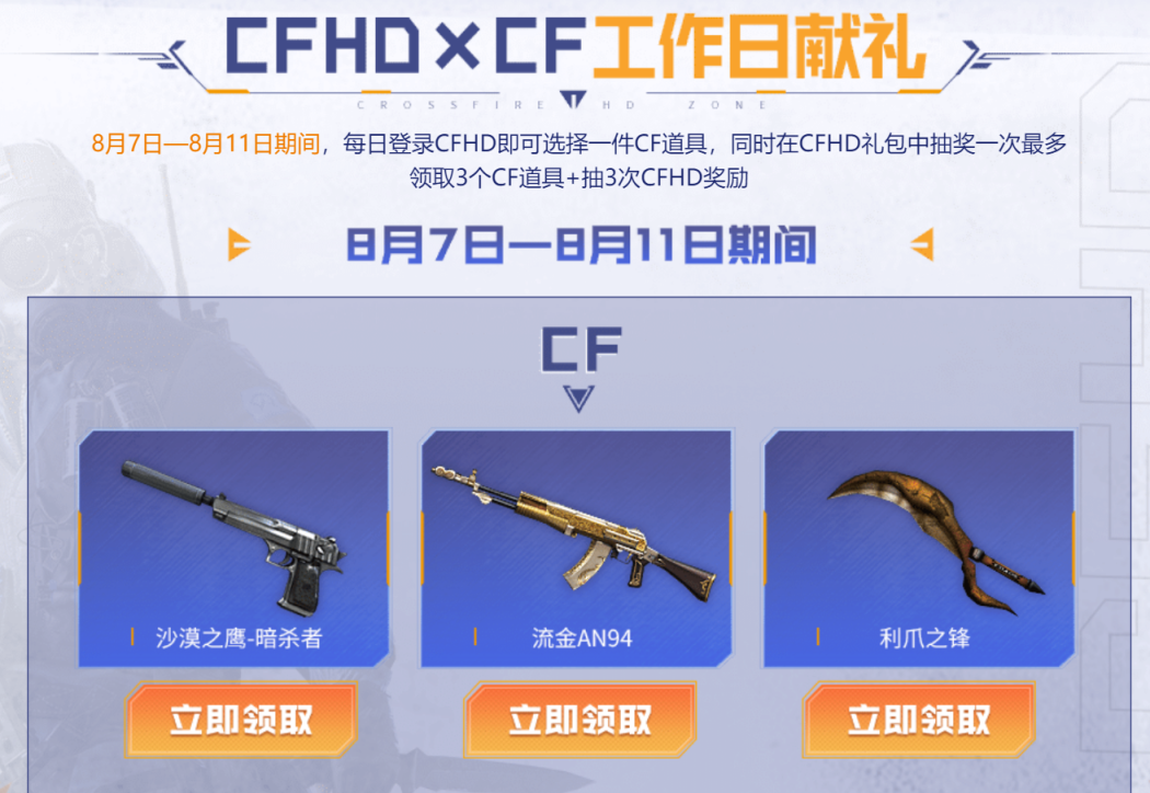 CF工作日礼包8月2023,活动期间登录CFHD即可选择一件CF道具,同时在CFHD礼包中抽奖一次,最多领取3个CF道具+抽3次CFHD奖励