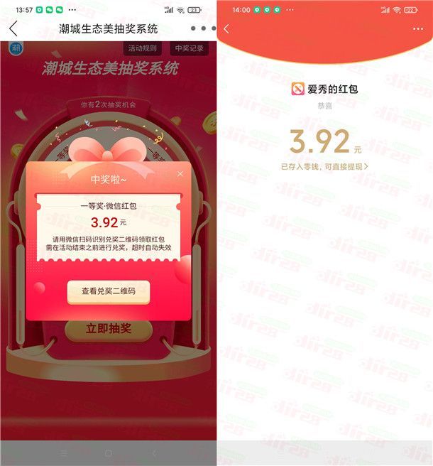 小编提示:下载打开大潮APP,首页点滚动图【潮城生态美】和图片【签到有礼】进去,第1个活动完成6个浏览可以抽奖3次,第2个活动在APP里签到可以抽奖,刚中3.92元,非必中