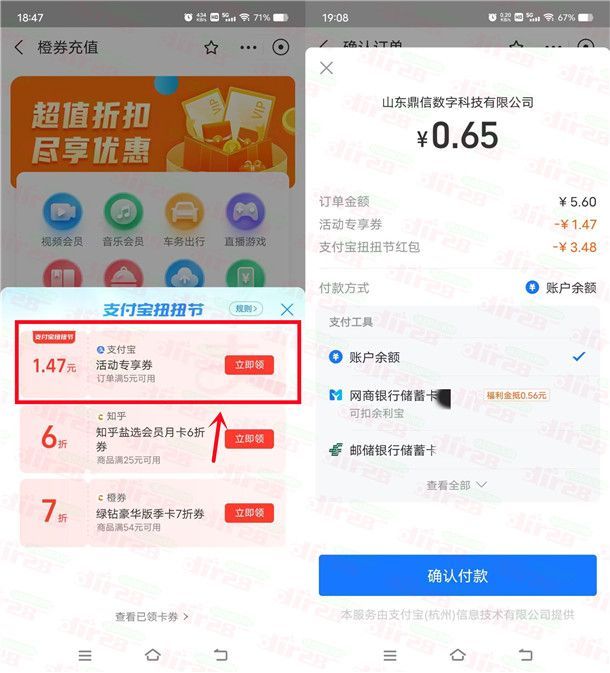 这个活动也是支付宝扭扭节的活动,可以通过多个渠道领到红包再去购买5元京东卡或者5元沃尔玛卡密抵扣,京东卡和沃尔玛卡密可以自用也可以出售。通过打开支付宝APP每天可以领到多个通用消费红包,领到红包后再去指定入口购买5元京东卡或者5元沃尔玛卡密就可以抵扣,小编测试0.64元购买了5元沃尔玛卡。