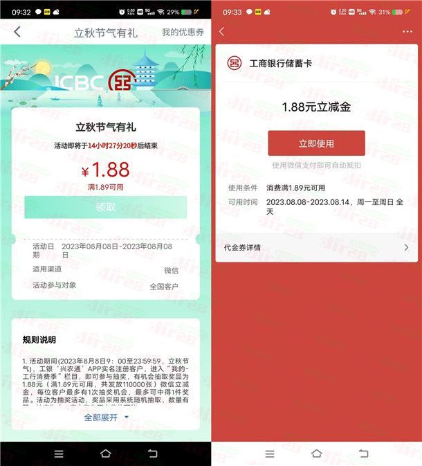 参加工银兴农通举办的节气有礼领微信立减金活动,这个活动兴农通的新老用户都可以去(建议老用户去),通过打开工银兴农通APP搜索【工行消费季】进去活动里,可以直接领取到1.88元微信立减金,领取的微信立减金秒到账,限量11万份先到先得。