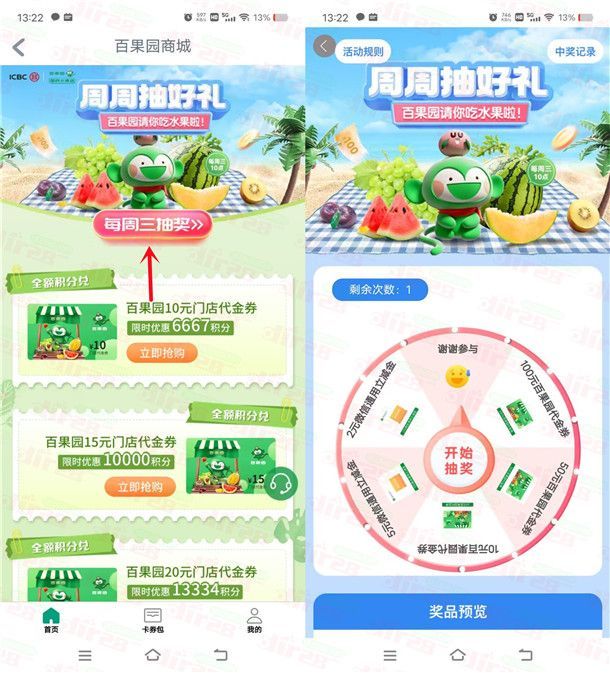 小编提示:打开中国工商银行APP搜索【百果园】进去,点顶部图片【每周三抽奖】进去,每周都可以抽奖1次,非必中