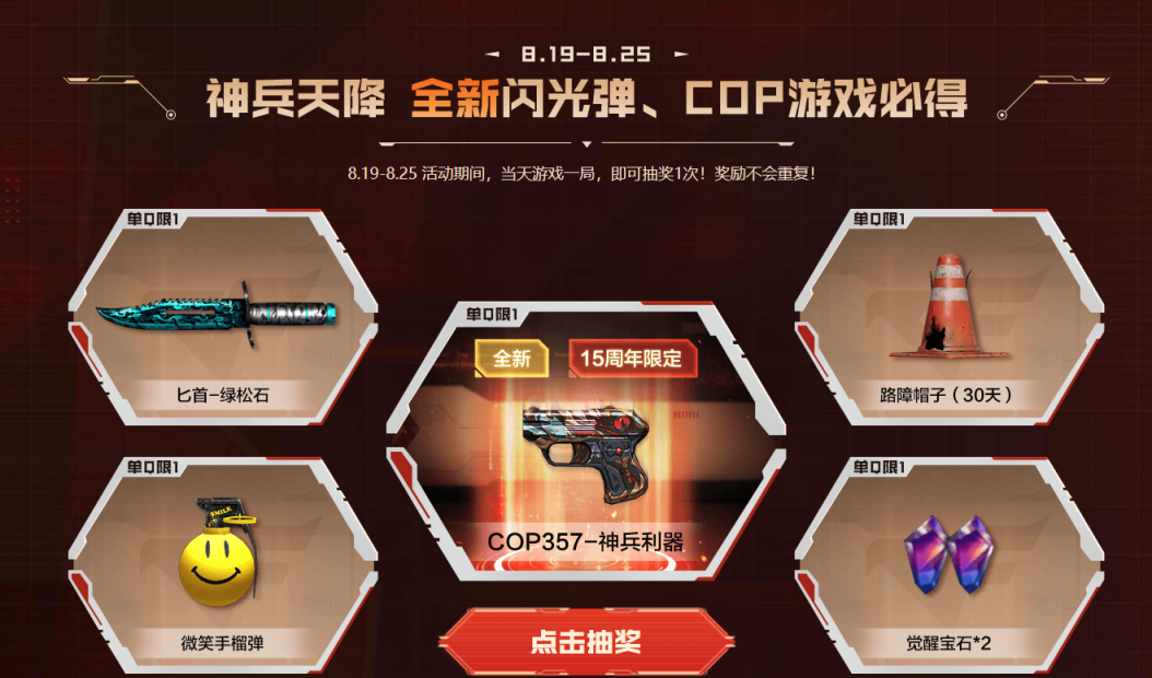 CF全新神兵专场活动,参与奖励Barrett-神兵利器、M4A1-朋克、加特林-幻能朋克、COP357-神兵利器、闪光弹-神兵利器、匕首-绿松石等
