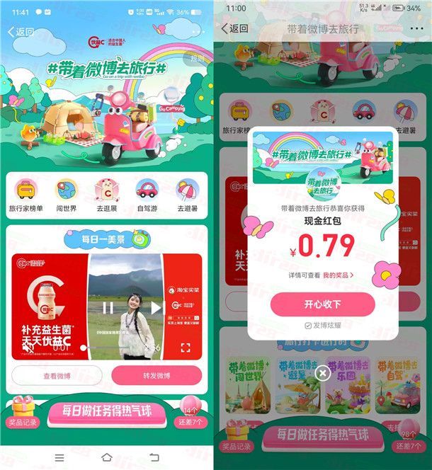 参加微博举办的每日做任务得热气球抽现金红包活动,之前也有过多次类似的活动,通过打开微博APP扫码进去活动里,点击右下角气球完成指定的任务可以得到气球,累积达到指定数量的气球可以抽奖,每次都有机会中到随机金额的现金红包,这个活动可以中多次,中到的现金红包可以提现到支付宝。
