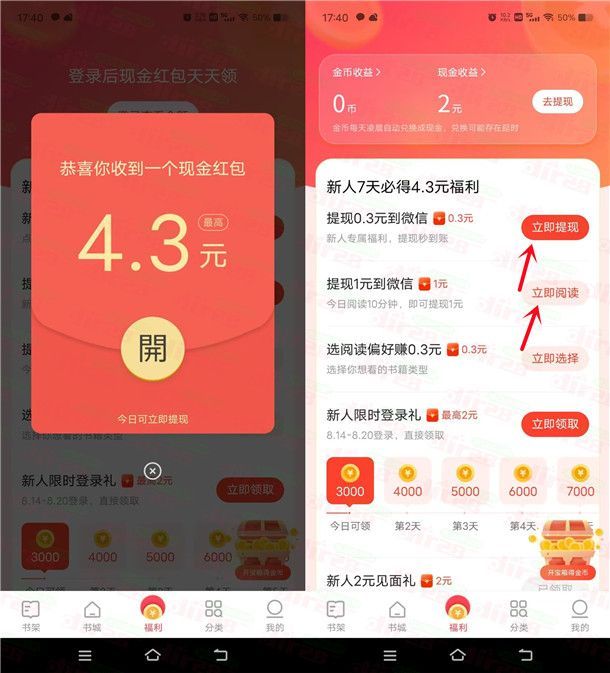 2、首次用微信登录会送2元红包,可以直接提现0.3元到微信秒推,然后再看10分钟小说还可以再提现1元到微信,也可以以挂机的方式听10分钟小说,合计加起来1.3元是秒推的,另外如果签到3天好像还可以再提现1元