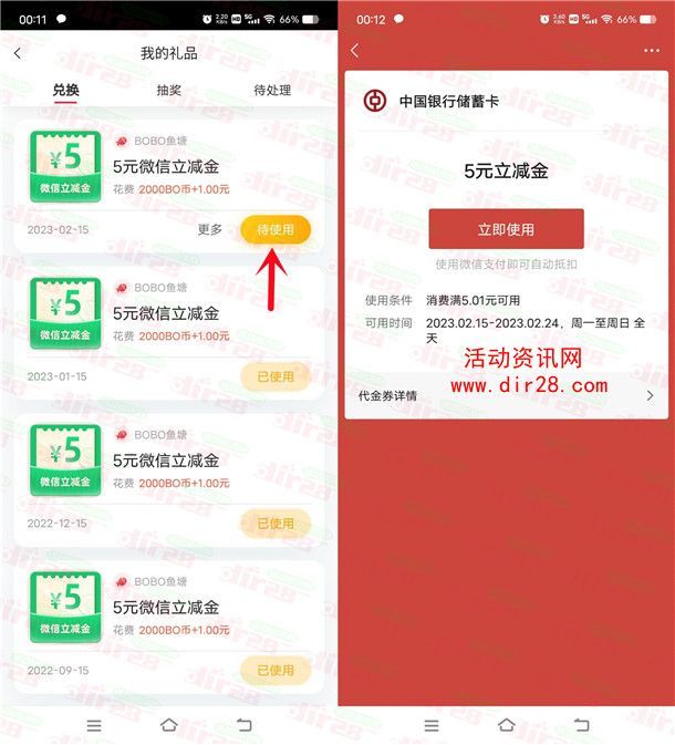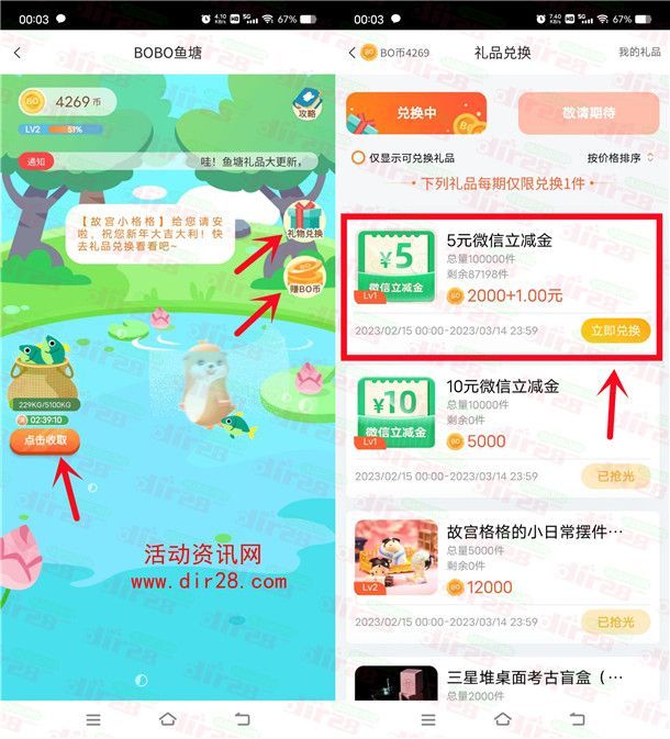 2、完成活动页面指定的任务、以及收集小鱼都可以得到BO币(每天完成浏览任务+收鱼都可以领到850个BO币),只要累积达到2000个BO币,就可以兑换5元微信立减金