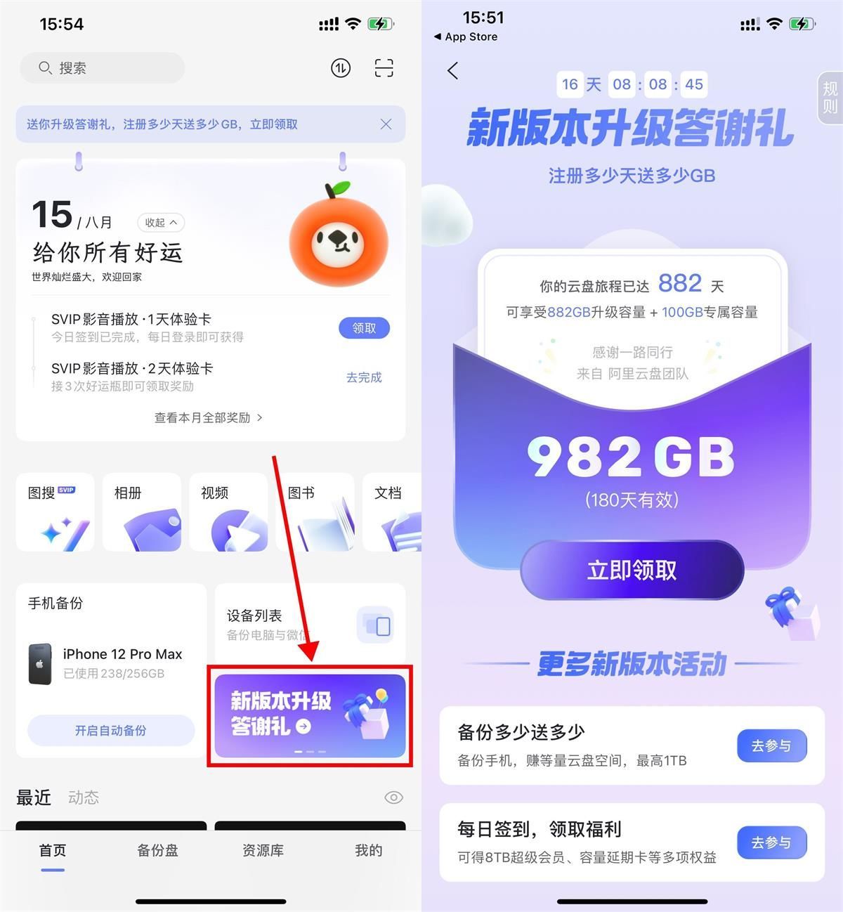 阿里云盘APP最新版->首页“新版本升级答谢礼”->注册多少天就可以领多少GB容量,容量有效期180天。