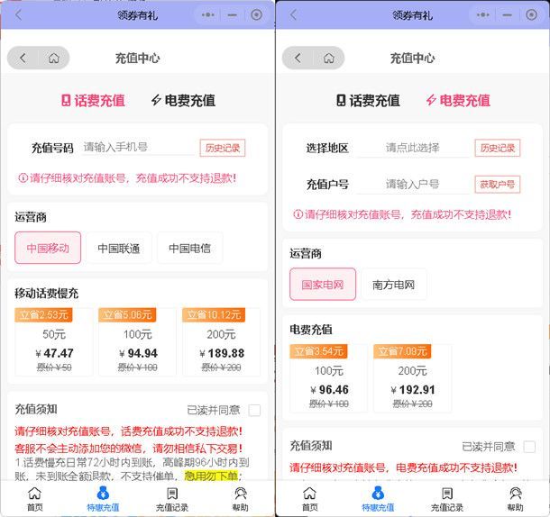 你还在原价充值话费电费吗?今天教你如何便宜充值话费电费,先给你们充值平台:’领券有礼’小程序。