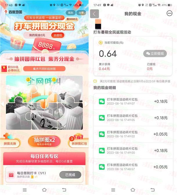 参加百度地图举办的打车拼图分现金活动,通过打开百度地图APP进去活动里,每天完成指定的任务可以获得抽拼图次数,每次都会中到一个随机的拼图和一个现金红包,红包需要手动拆开,金额随机,累积得到的现金红包满2元提现,每天都可以去,百度地图的活动还是比较容易满足提现的。