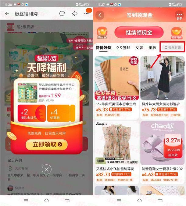 1,复制淘口令,打开淘宝APP点弹窗进去领取淘礼金和优惠券(如果没有弹淘礼金就换号看看),领到券之后别下单,继续看下一步