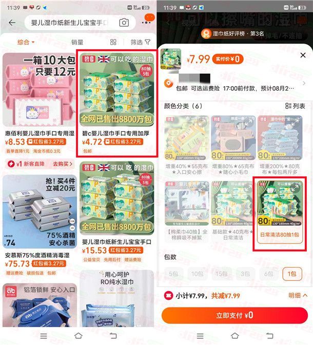 3,在签到页面搜索【婴儿湿巾纸新生儿宝宝手口专用家庭实惠大包装特价厕纸家用湿纸巾】进去下单“80抽”就是0元(搜索框在签到页面下拉一点点位置右侧)
