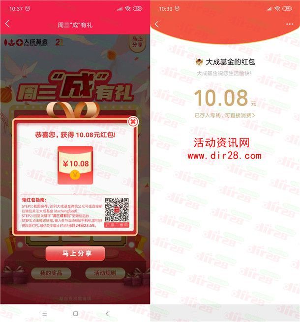 大成基金新一期成有礼抽最高188元微信红包 亲测中10.08元
