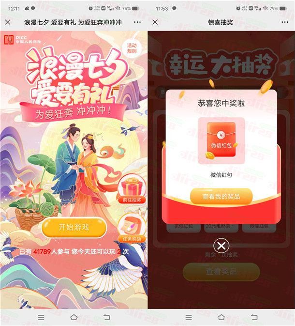 中国人保财险浪漫七夕抽随机微信红包、实物 亲测中1元