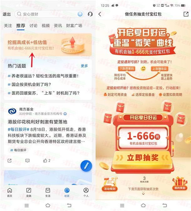 小编提示:打开交通银行APP,点底部【社区】再点顶部图片【挖掘高成长+低估值】进去,下拉页面完成关注+浏览+随便发帖可以抽奖3次,刚中10元支付宝红包,中到的红包需要手动领取,红包也可以变现,非必中
