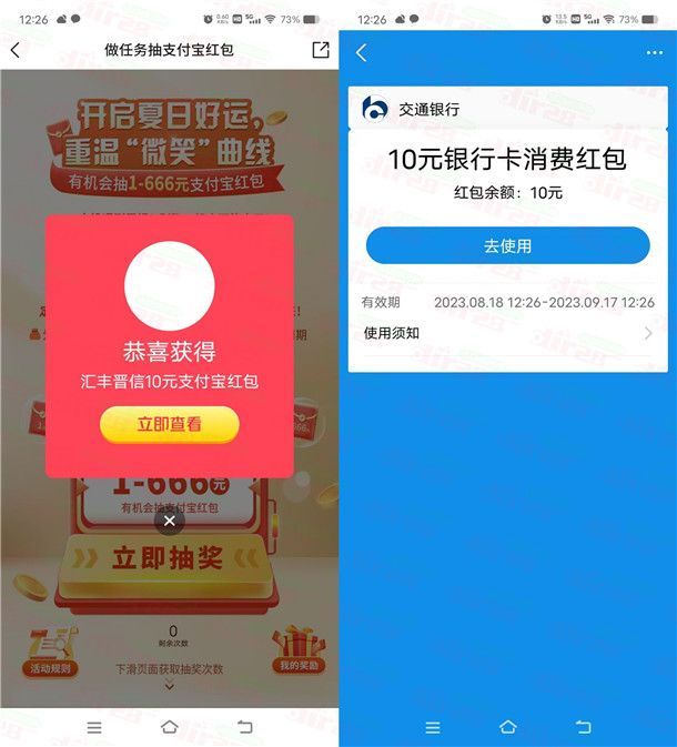交通银行开启夏日好运抽1-666元支付宝红包 亲测中10元秒到
