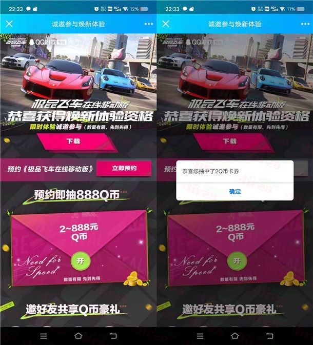 极品飞车预约领取2-888个Q币卡券 手游上线可兑换领取