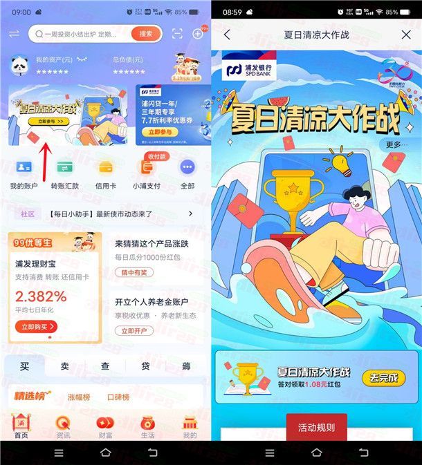 小编提示:打开浦发银行APP,首页点顶部轮播图【夏日清凉大作战】进去,3题全部答对可以领到1.08元微信立减金,限量10万份