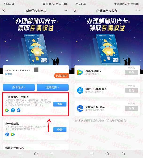 邮储闪光卡浪漫七夕特别礼领50元支付宝红包、腾讯视频会员季卡