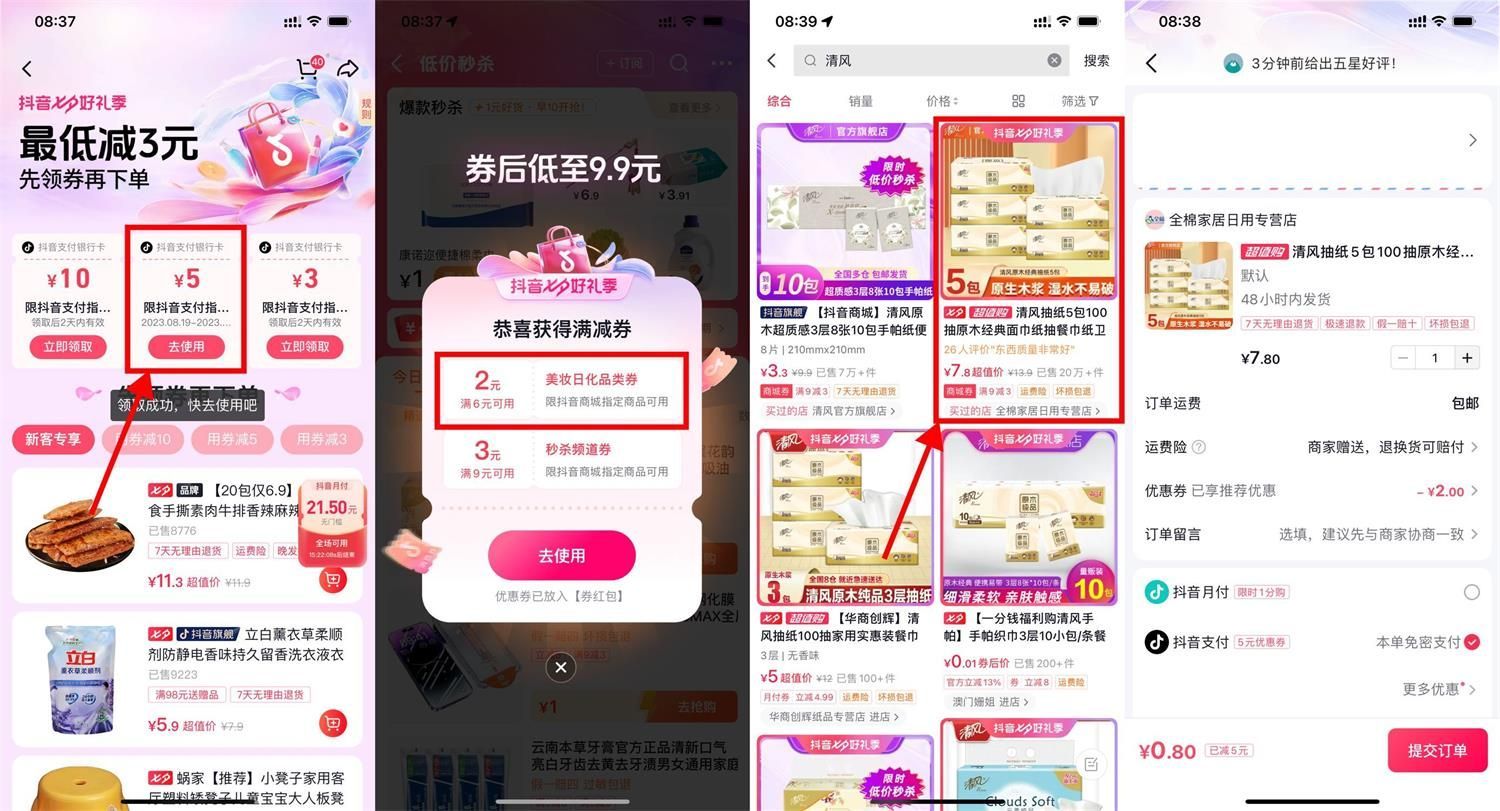 抖音APP扫码领5元支付券->抖音搜索“低价秒杀”弹出2元券->右上角搜索“清风”点图3进入,两张券叠加使用0.8元到手
