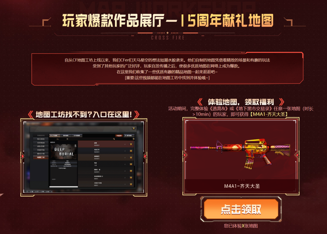 CF地图工坊全民创造节活动,完整体验《逃离&》或《地下黑市交易录》任意一张地图(时长>10min)的玩家,即可领取M4A1-齐天大圣