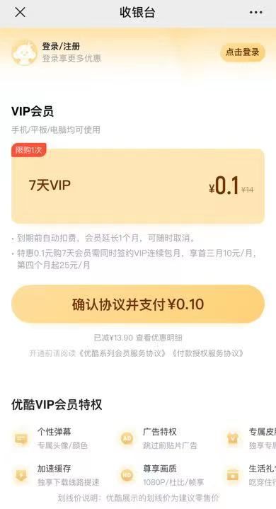 微信扫码打开支付0.1元可以开通7天优酷VIP会员,开通后再去微信APP–我–服务–钱包–支付设置–自动续费–取消优酷连续包月就不会自动续费了