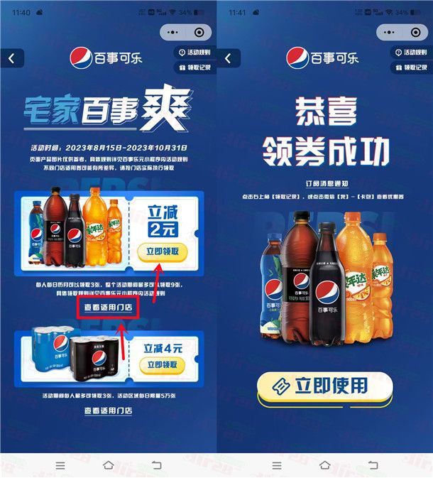 参加百事可乐举办的宅家百事爽活动,通过打开微信进去小程序活动里,每个微信每月可以领到3张立减2元券,领到券后可以1元喝百事可乐,需要看看自己当地有没有门店再参加领取,大部分省份都可以,喜欢喝可乐的可以去领券参加。