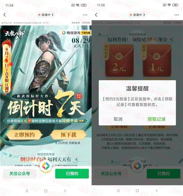 参加新天龙八部举办的手游倒计时预约领红包活动,通过打开微信进去活动里,进去预约游戏可以领到2元微信红包,邀请好友还可以领到8元红包,领到的红包以卡券的形式到账,在8月29日手游上线后可以在微信福利中心兑换领取。