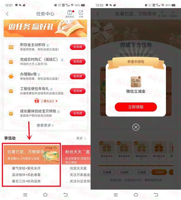 小编提示:打开中国工商银行APP搜索【任务中心】进去点享活动下面的【处暑已至万物荣华】进去,完成4个浏览任务可以抽奖5次,刚中1.66元,非必中